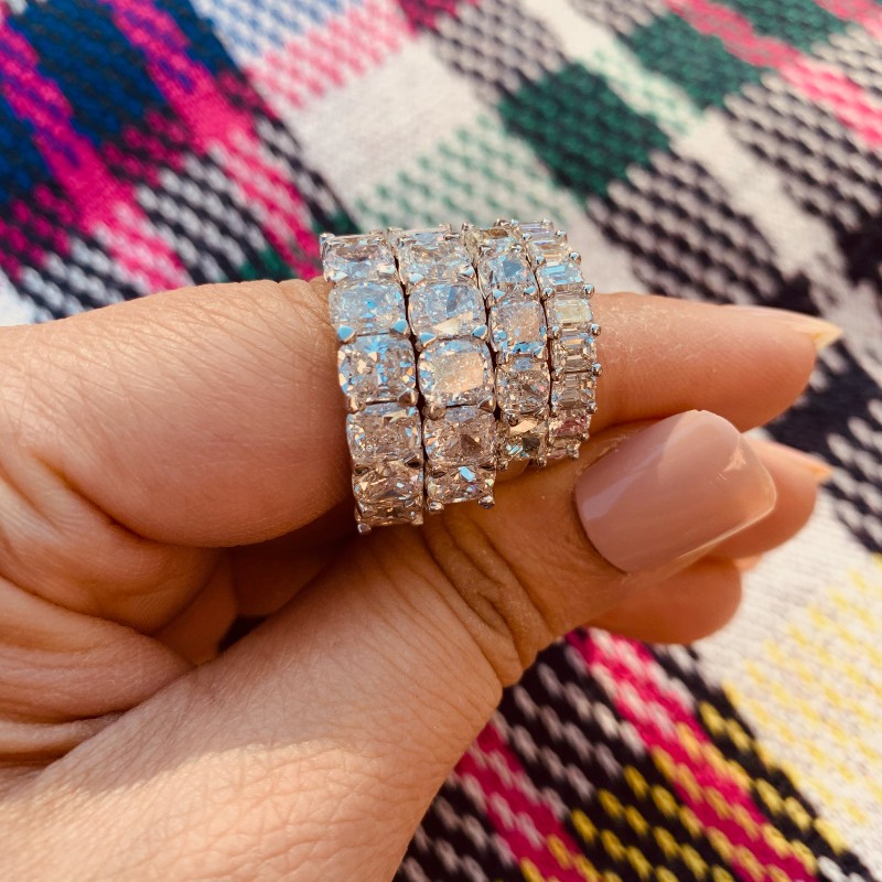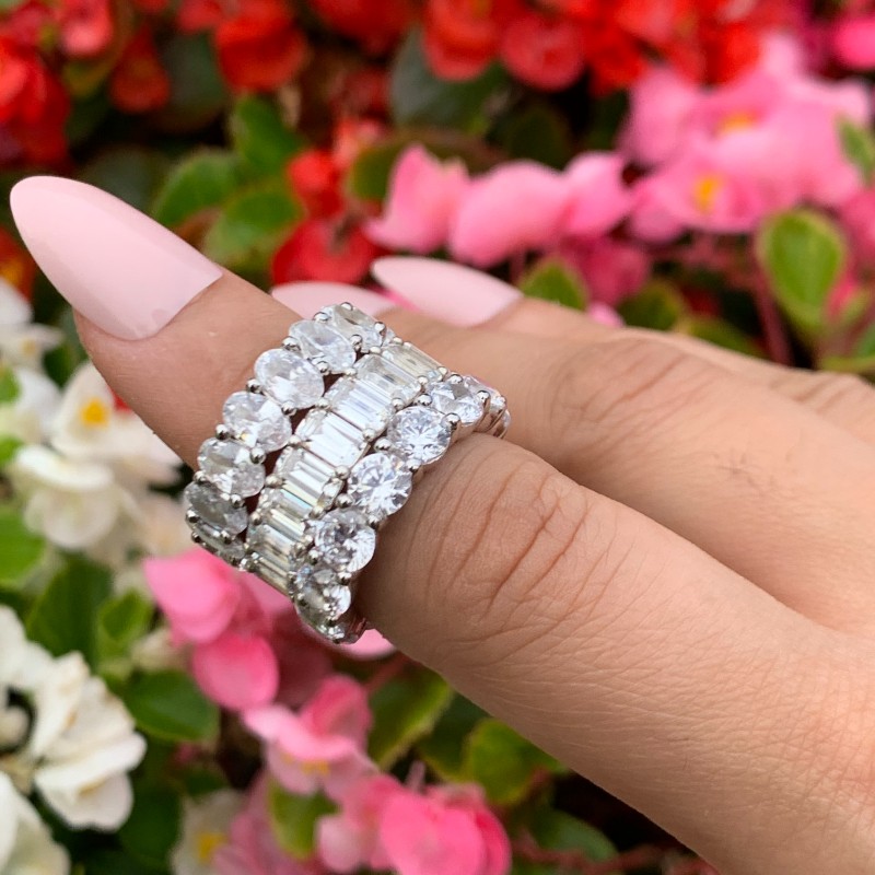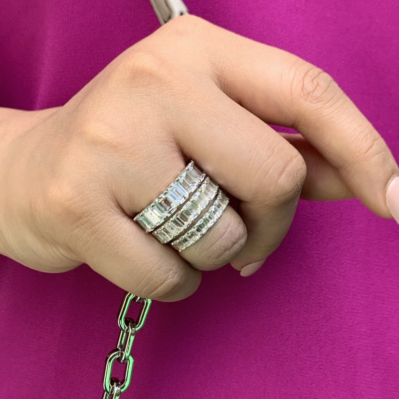 14K White Gold Bezel Set Emerald Cut and Round Diamond Anniversary Band