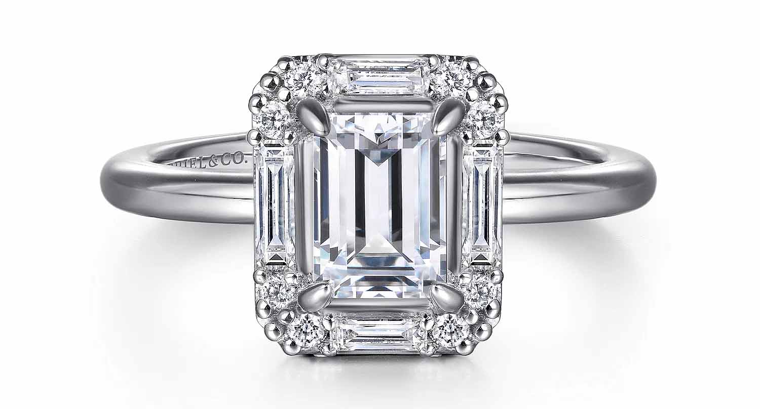 Art Deco 14K White Gold Halo Emerald Cut Diamond Engagement Ring