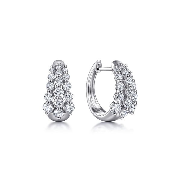 14K White Gold 15mm 3 Row Single Prong Set Graduating Diamond Huggie Earrings J.A. Jewelers & Company, Inc. FARMINGTON, NM