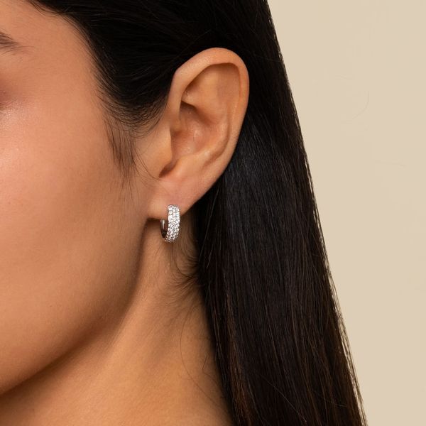 14K White Gold 15mm Diamond Huggie Earrings Image 2 J.A. Jewelers & Company, Inc. FARMINGTON, NM