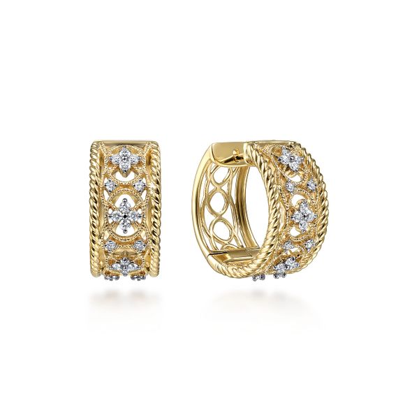 14K Yellow Gold Wide Twisted 15mm Intricate Diamond Huggies J.A. Jewelers & Company, Inc. FARMINGTON, NM