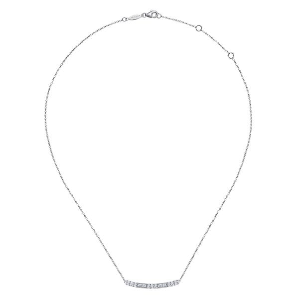 14K White Gold Round and Baguette Diamond Curved Bar Necklace Image 2 J.A. Jewelers & Company, Inc. FARMINGTON, NM