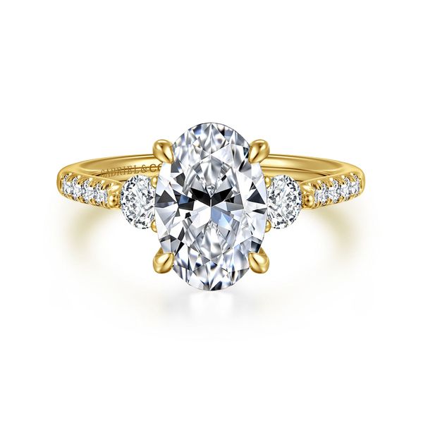 14K Yellow Gold Oval Three Stone Lotus Diamond Engagement Ring