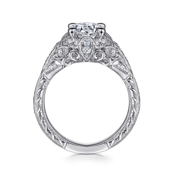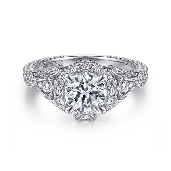 Unique 14K White Gold Vintage Inspired Diamond Halo Engagement Ring