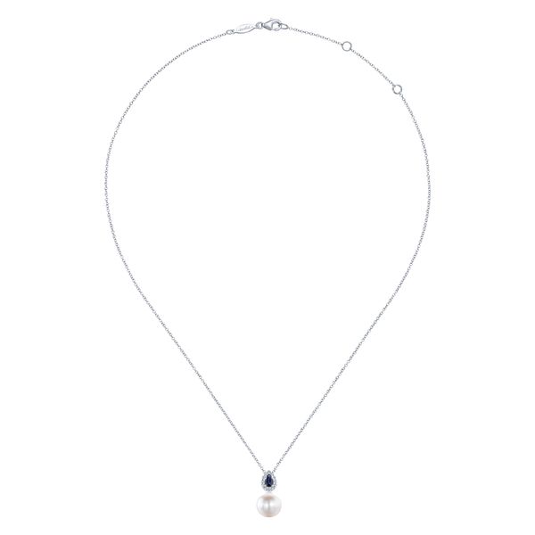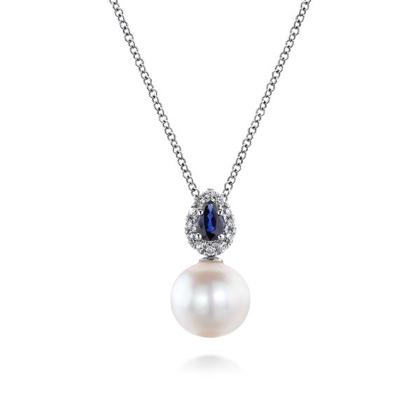 14K White Gold Pear Shaped Sapphire and Diamond Halo Pendant Necklace with Pearl J.A. Jewelers & Company, Inc. FARMINGTON, NM