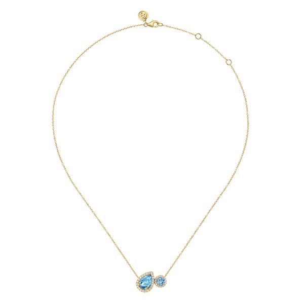 14K Yellow Gold Toi et Moi Blue Topaz and Diamond Halo Necklace J.A. Jewelers & Company, Inc. FARMINGTON, NM