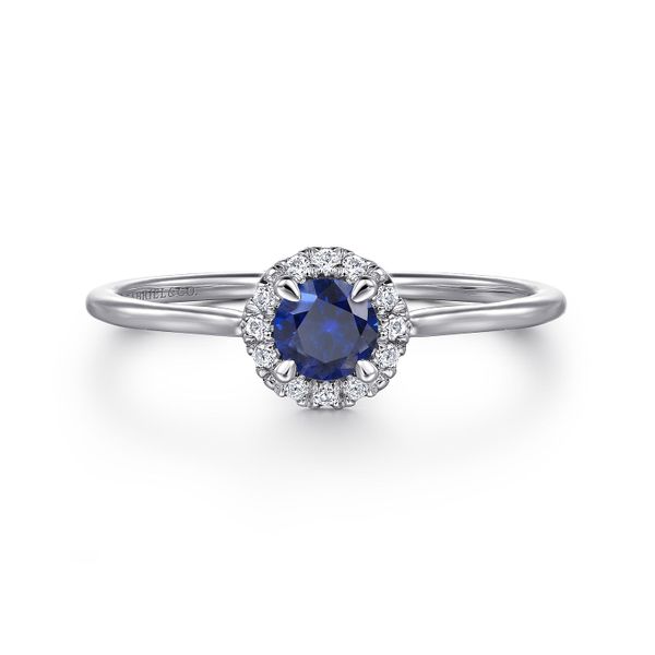 14K White Gold Blue Sapphire and Diamond Halo Promise Ring J.A. Jewelers & Company, Inc. FARMINGTON, NM