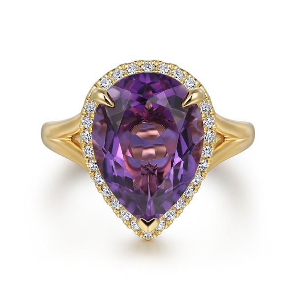 14K Yellow Gold Diamond and Flat Pear Shape Amethyst Ladies Ring With Flower Pattern Gallery J.A. Jewelers & Company, Inc. FARMINGTON, NM
