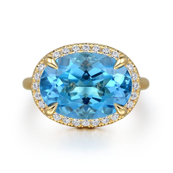 14K Yellow Gold Diamond and Oval Shape Blue Topaz Ladies Ring With Flower Pattern Gallery J.A. Jewelers & Company, Inc. FARMINGTON, NM