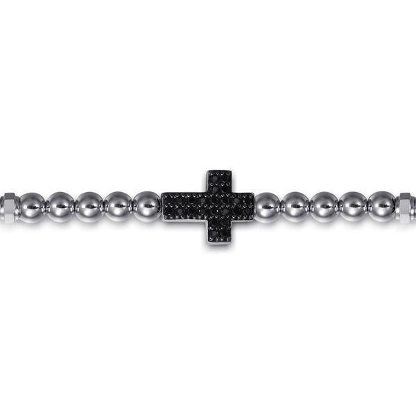925 Sterling Silver and 4mm Silver Beaded Mens Bracelet with Black Spinel Cross Image 2 J.A. Jewelers & Company, Inc. FARMINGTON, NM