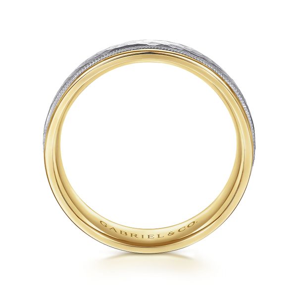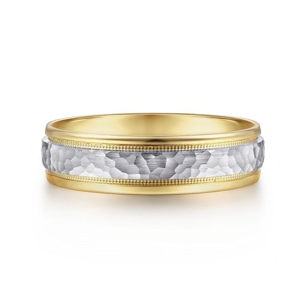 14K White-Yellow Gold 6mm - Two Tone Hammered Men's Wedding Band with Milgrain Edge